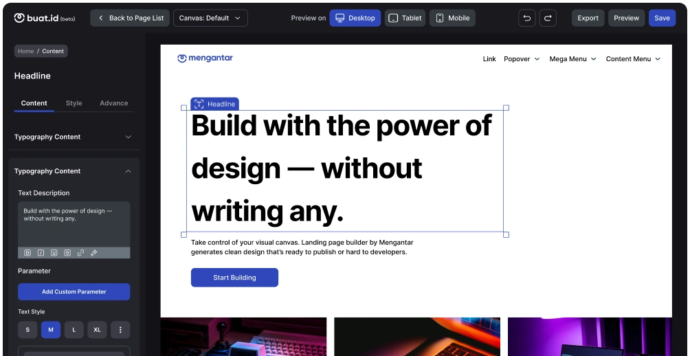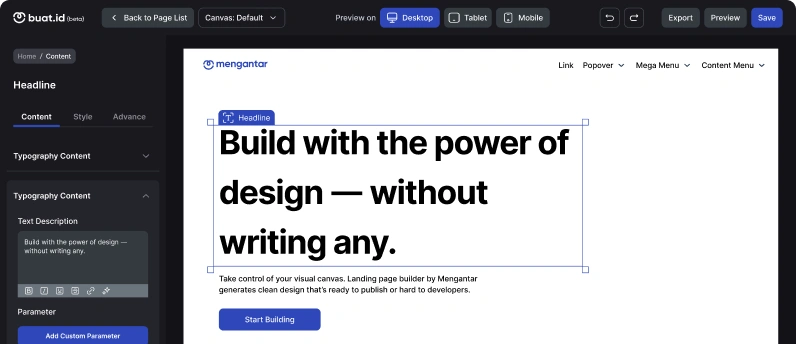 Kamu bisa impor dan ekspor konten landing page yang sudah ada dalam builder buat.id. Lebih cepat dan efisien!