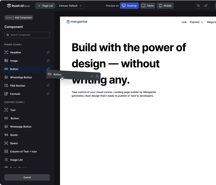 buat.id memiliki komponen landing page builder yang lengkap dan relevan untuk keperluan bisnismu