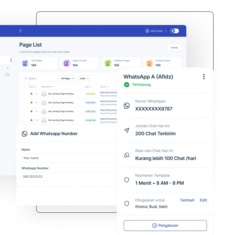 Cukup buat satu landing page dan kamu bisa hubungkan ke banyak nomor whatsapp untuk CS-mu. Pesanan anti menumpuk, pelanggan puas!